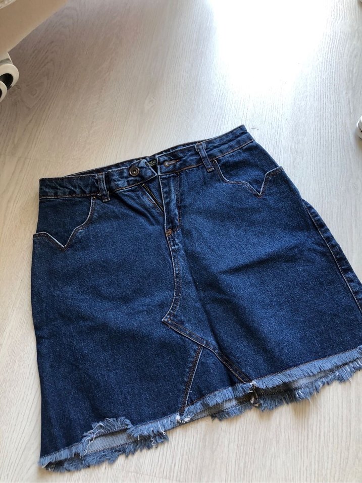 Mavi parlak denim midi etek, salaş kesim ve salaş kenar detaylarıyla günlük rahat şıklık sunar.