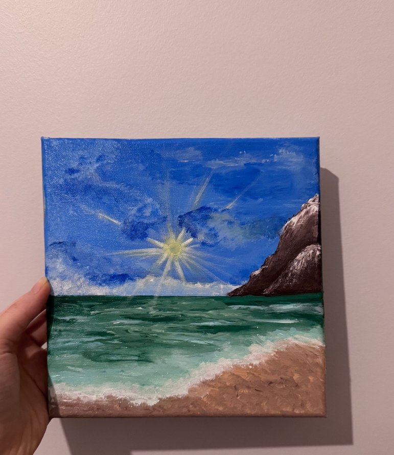 Mavi parlak gökyüzü, yeşil deniz, kumlu plaj ve kayalık uçurumun yer aldığı küçük bir tablo. Güneş parlak parlıyor, huzurlu bir sahil manzarası oluşturuyor. Tablo ölçüsü : 20x20