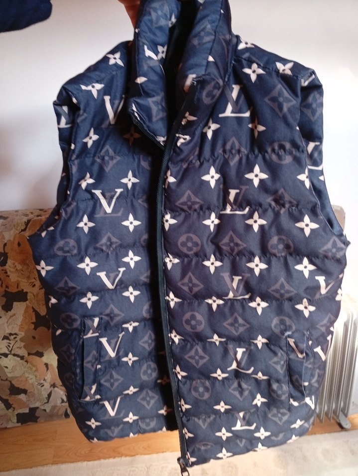 Mavi parlak renkte, desenli ve V yakalı şişme yelek. Fermuarlı ve bol kesim, günlük rahat kullanıma uygundur.