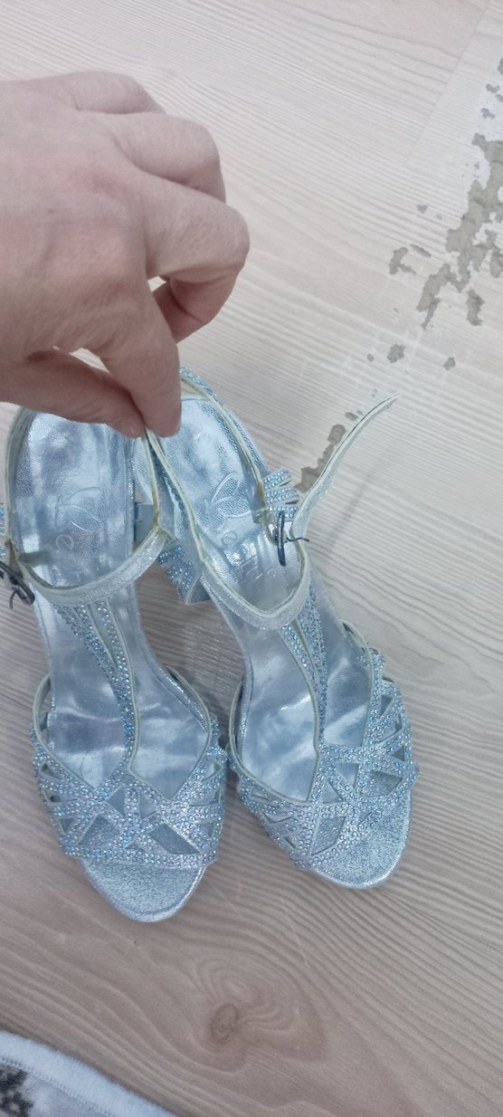 Mavi parlak yılan desenli, tokalı stiletto topuklu kadın ayakkabısı. Düğün gibi göz alıcı etkinlikler için uygundur. parlak taşlı .