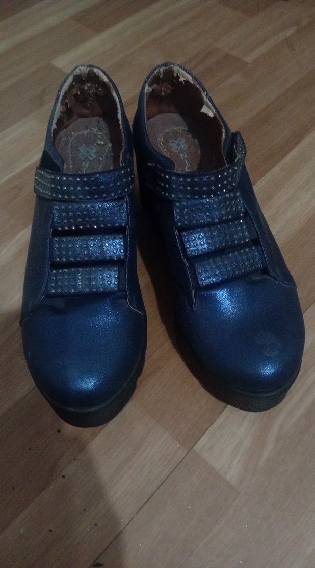 Mavi parlak, dolgu topuklu, tokalı, kauçuk malzemeden kadın spor ayakkabısı. Trendy günlük sokak stili için uygundur. hafif parlak laci marjinal bir tarz aslında giyilmemiş fakat beklemeye bağlı dökülmeler mevcur fiyat uygun stiline uyan alsın