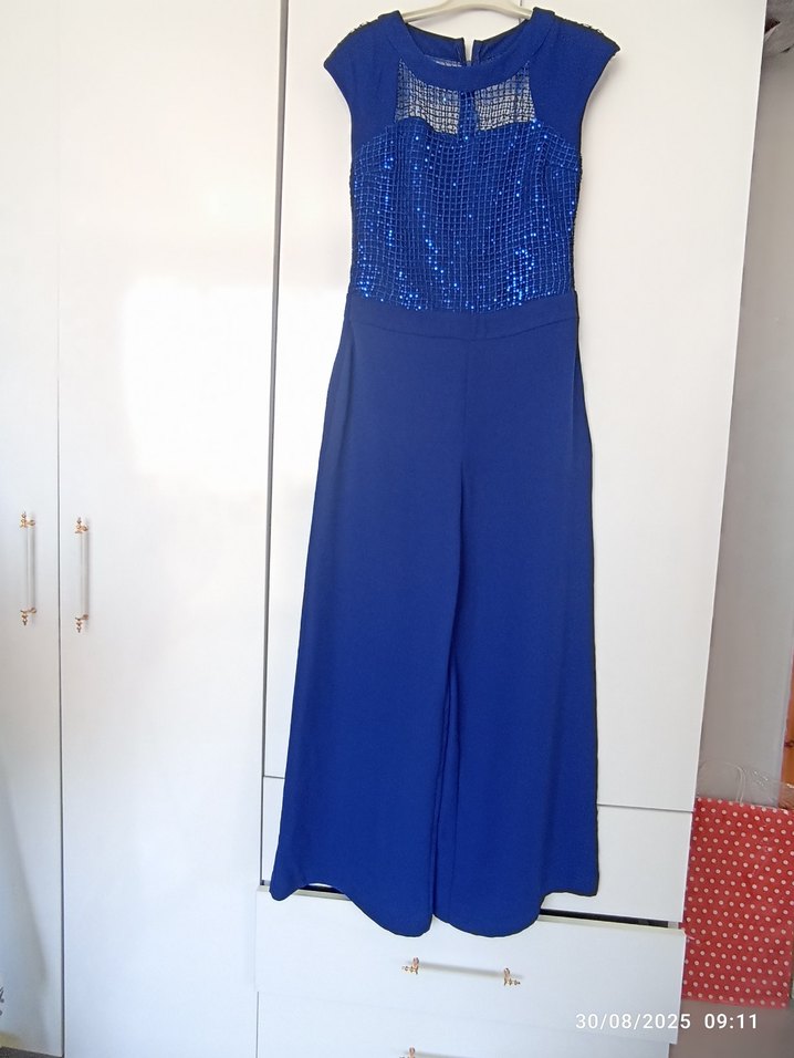 Mavi parlak kumaştan, drapeli ve straplez yaka detaylı, uzun ve vücuda oturan kadın tulumu. Partiler için uygun şık tasarım. ✨ üründe darâltma yapılmıştır 38 beden de kullanılır