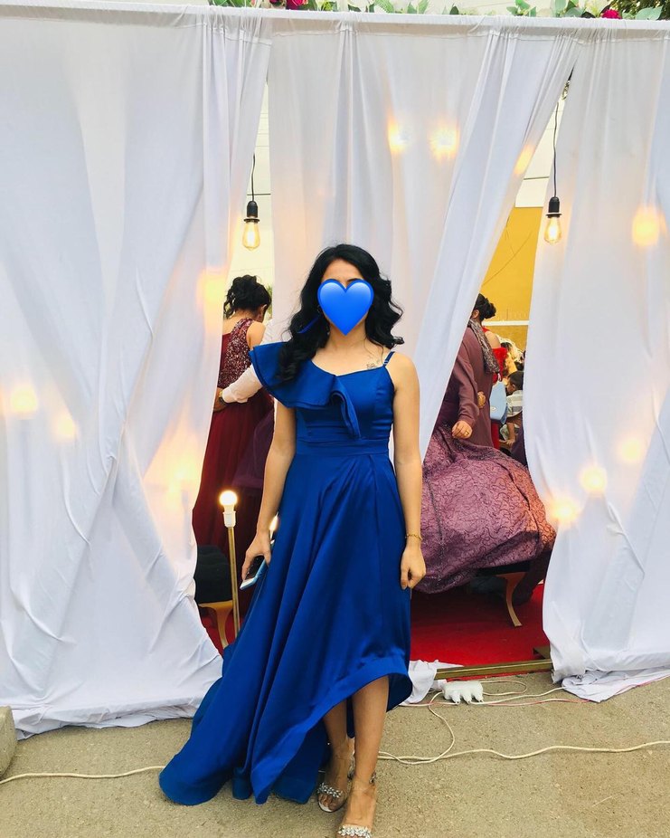 Parlak mavi kumaştan harika bir abiye