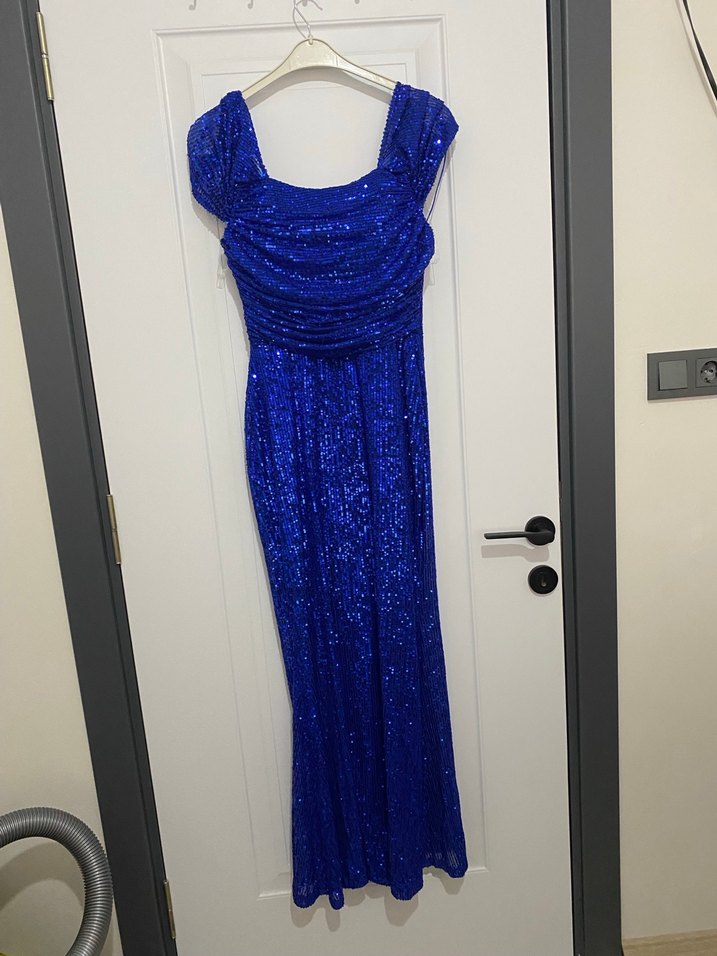 Mavi Parlak Drapeli Uzun Kadın Abiye Elbise