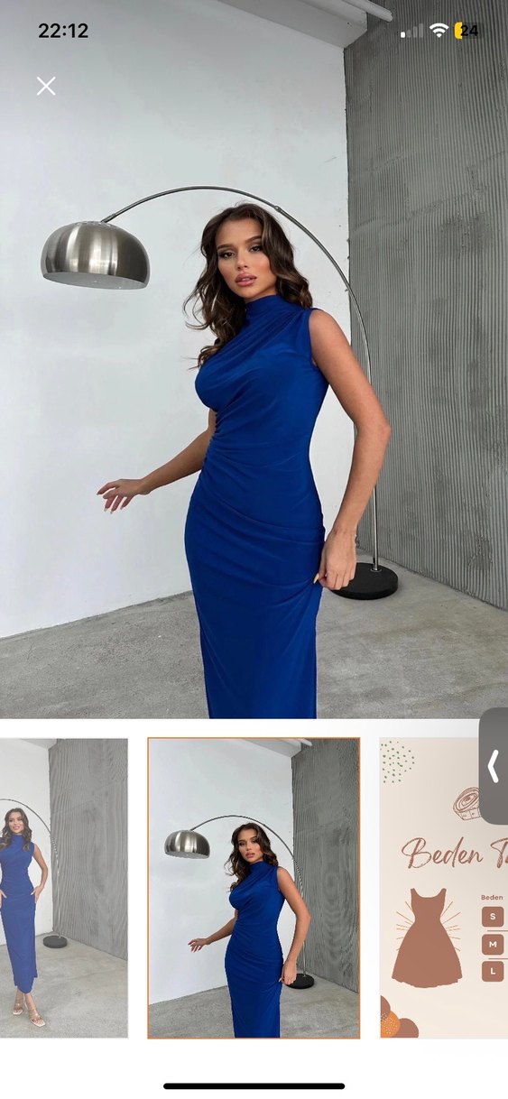 Vücuda oturan, parlak mavi sentetik kumaştan uzun elbise. Drapeli detayları, tekne yaka ve kolsuz tasarımıyla romantik akşamlar için uygun.