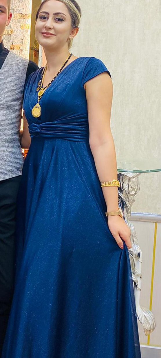 Parlak mavi kumaştan, V yakalı ve drapeli detaylara sahip, ince kesim midi abiye elbise. İnce askılı kollarıyla şık ve zarif bir görünüm sunar.