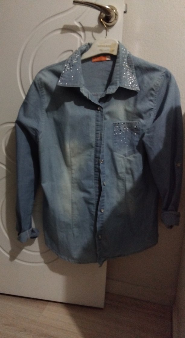 Mavi parlak denim kumaştan, düğmeli ve yakalı kadın gömleği. Uzun kollu, bol kesim ve yakada ile cepte hafif süslemeler bulunur. Günlük sokak stili için uygundur.