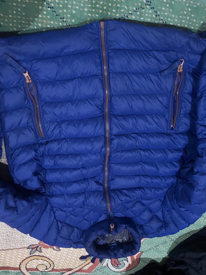 Parlak mavi renkli, fermuarlı astarlı cepli ve kesik yakalı, sentetik kumaştan yapılmış, rahat kışlık mont. tarzı yansıtan bir parça. Takas var