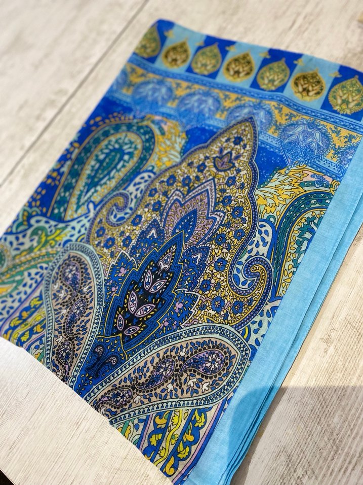 Mavi parlak tonlarda, etnik desenli, satenimsi dokulu, bohem tarzda kadın fular. Drapeli ve şık görünümlü.