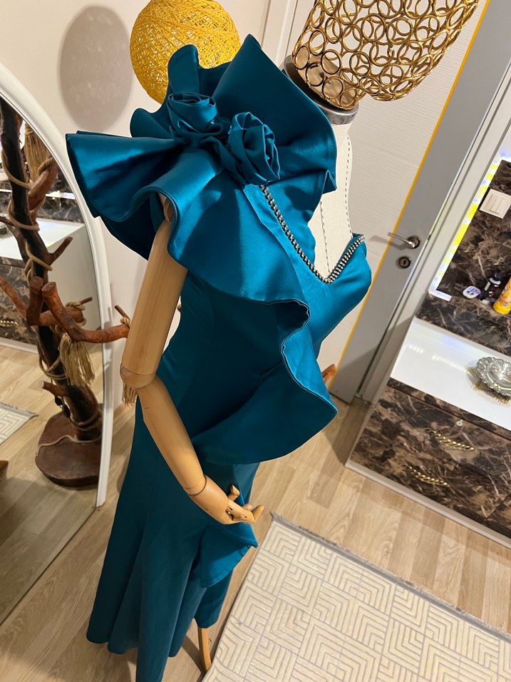 Mavi Parlak Fırfırlı Uzun Abiye Elbise