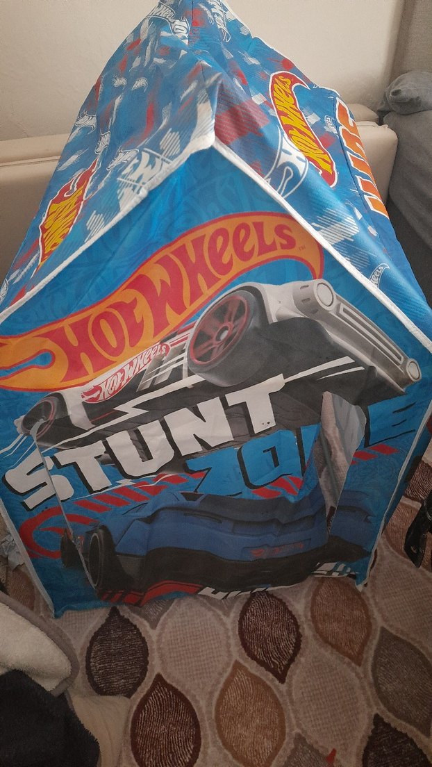 Mavi renkli Hot Wheels oyun çadırı, parlak renkler ve stunt araba görselleriyle eğlenceli oyun alanı sağlar.