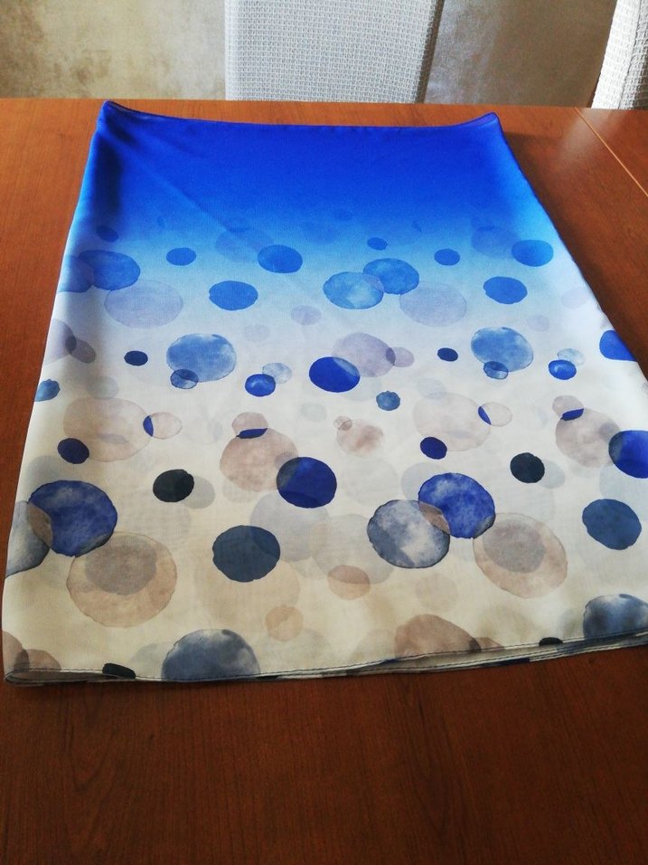 Mavi ve beyaz renklerde, dairesel desenli parlak ipek kumaştan drapeli kadın fular, çağdaş ve minimalist tarzda.