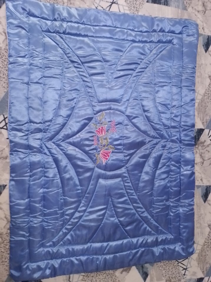 Sentetik kumaştan yapılmış, ortasında işlemeli çiçek desenleri bulunan parlak mavi çocuk battaniyesi. ️ saten işlemeli çocuk battaniyesi yeni sadece durmaktan sarardı eni 93 uzunluk 125 santimdir rengi canlı parlak mavi içi beyaz akfil