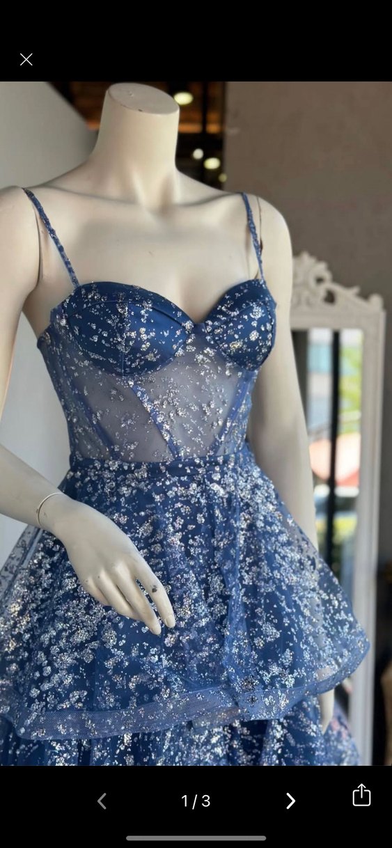 Mavi, parlak işlemeli, ince askılı straplez mini elbise, bohem tarzda, parti için uygun, vücuda oturan kesim. ✨ bedeni 38 yazıyor ama 36 ya uygun daralttırıldı