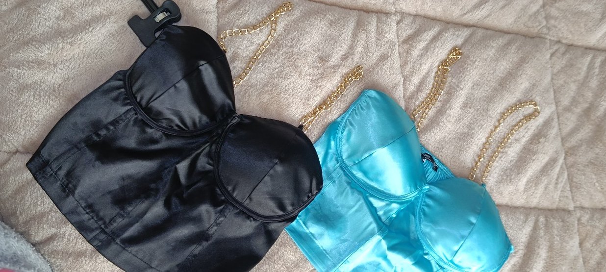 Parlak mavi saten görünümlü, işlemeli kısa büstiyer, askısız ve fermuarlı, parti için uygun şık bir parça. s m bedene uygundur ✨