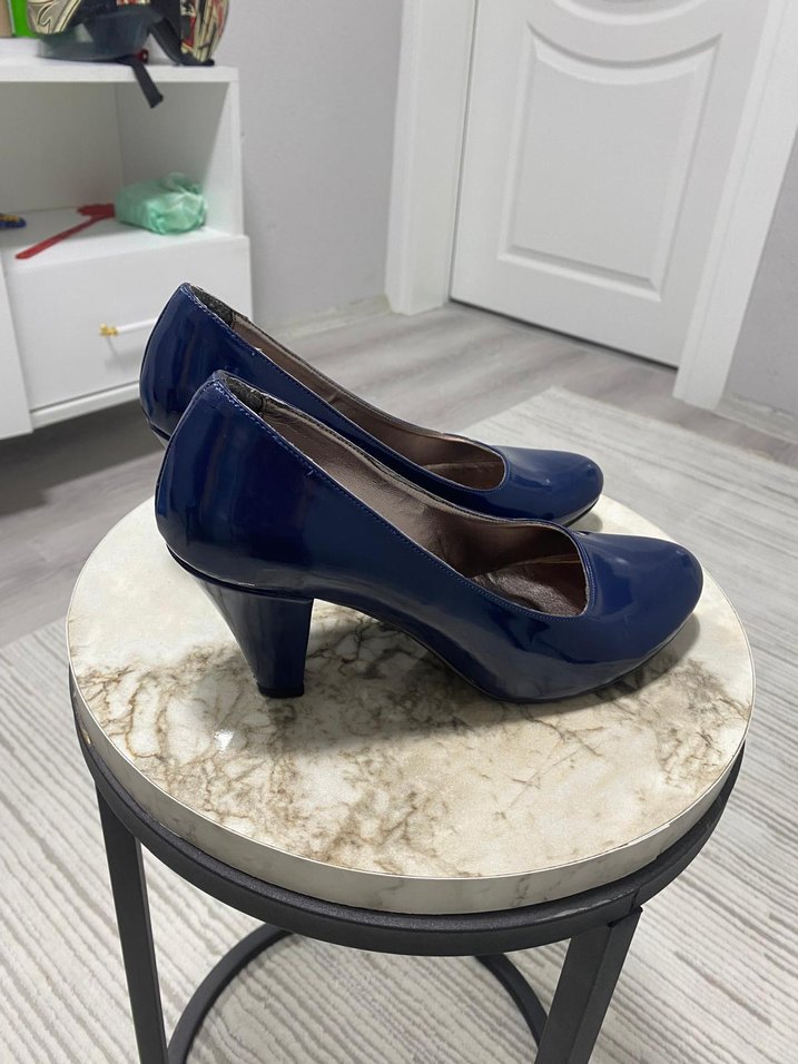 Mavi parlak yüzeye sahip, lastik malzemeden yapılmış kadın topuklu ayakkabılar. Modern klasik ve Paris tarzını ofis kullanımı için birleştirir.