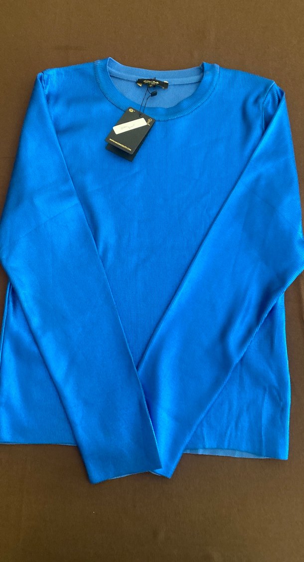 Mavi, saten kumaştan, bisiklet yaka ve uzun kollu, vücuda oturan kadın kazak. Günlük sokak modasına uygun, zahmetsiz şıklık sunar. Ürün orjinal değildir