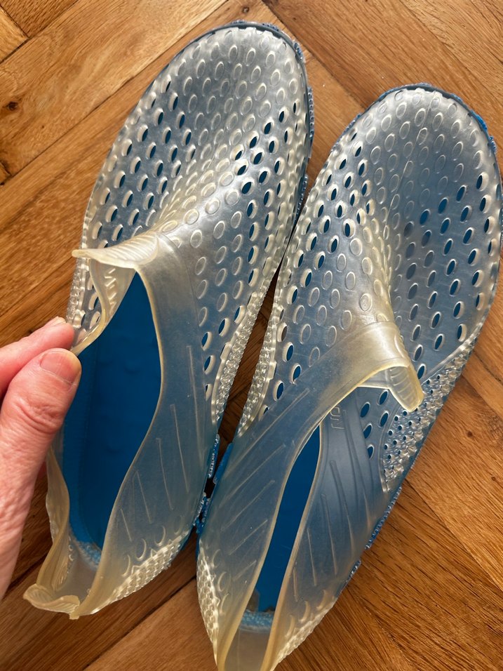 Mavi parlak renkte, Velcro kapamalı erkek su ayakkabısı. Esnek kauçuk malzemeden üretilmiş, günlük kullanıma uygun rahat bir model. Deniz ve havuz ayakkabısı