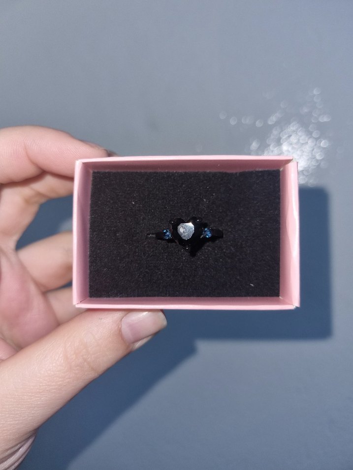 Koyu mavi, parlak kalp detaylı gotik yüzük. Minimalist ve rock punk tarzıyla romantik akşamlar için uygun.