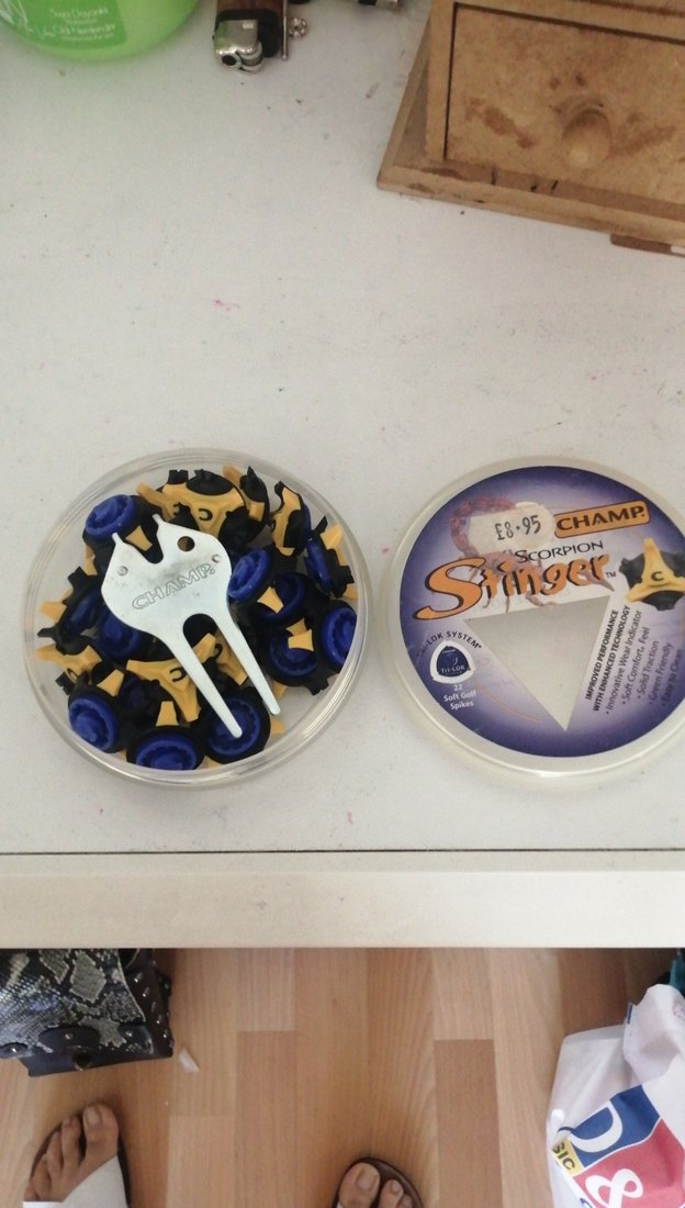 Parlak mavi renkte Champ markalı kedi aksesuarları, küçük parçalar ve metal aparat içeren yuvarlak kutuda. "8.95CHAMP" etiketi bulunur.