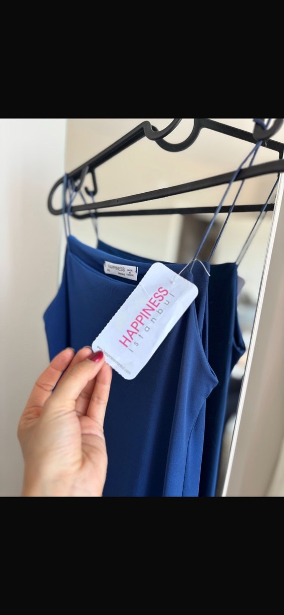 Mavi Parlak Midi Askılı Elbise