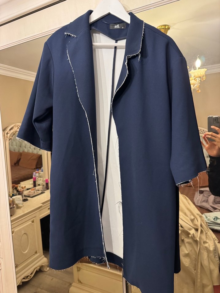 Mavi parlak midi ceket, düğmeli ön ve kısa kollu, notched lapel yakaya sahip. Sentetik kumaştan, regular fit kesim. Ofis için Paris tarzı şık model.