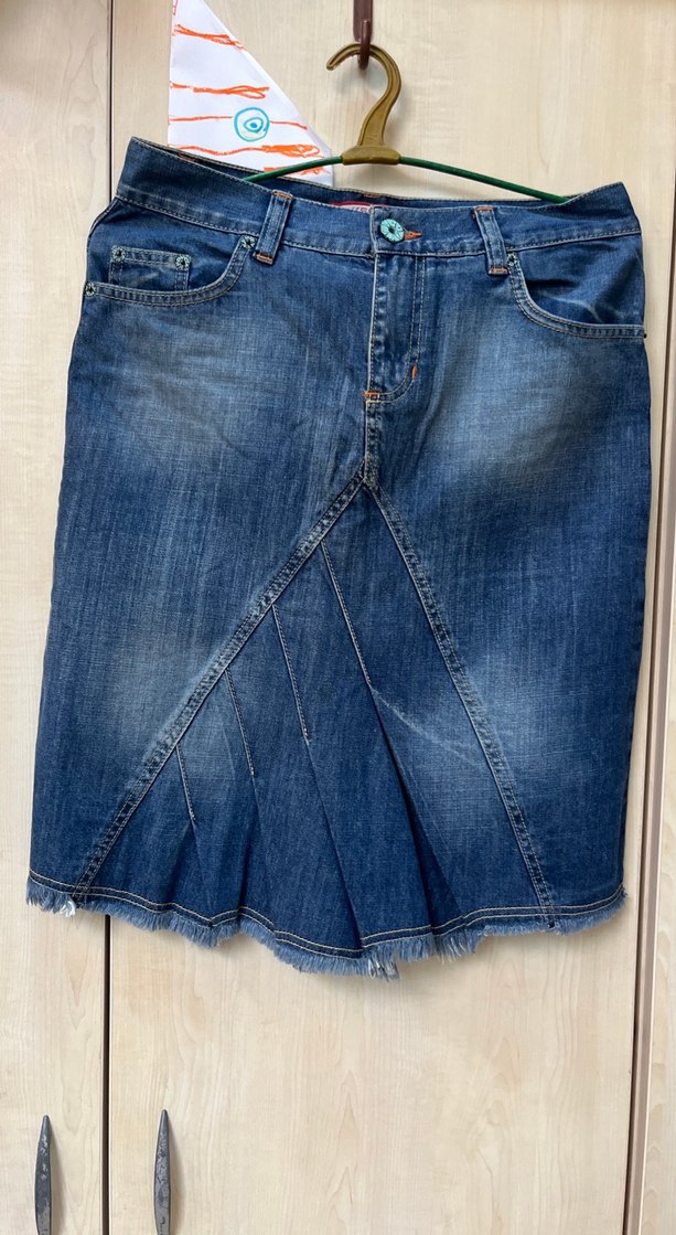 Mavi parlak kot kumaştan etekpile detaylı ve bol kesimdir. Midi boyda, desensiz, günlük kullanıma uygun normcore tarzda bir etektir.1-2 defa ancak kullanılmıştır.