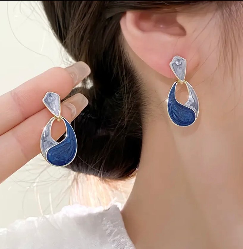 Parlak mavi tie-dye desenli, minimalist ve çağdaş tasarımlı midi uzunlukta kadın küpeleri, günlük rahat kullanım için uygundur.