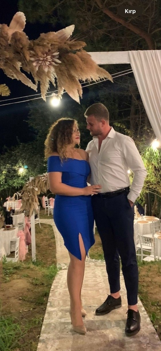 Mavi parlak mini elbise, straplez yakalı ve yırtmaçlıdır. Kısa kollu, cesur ve romantik bir akşam için uygundur.