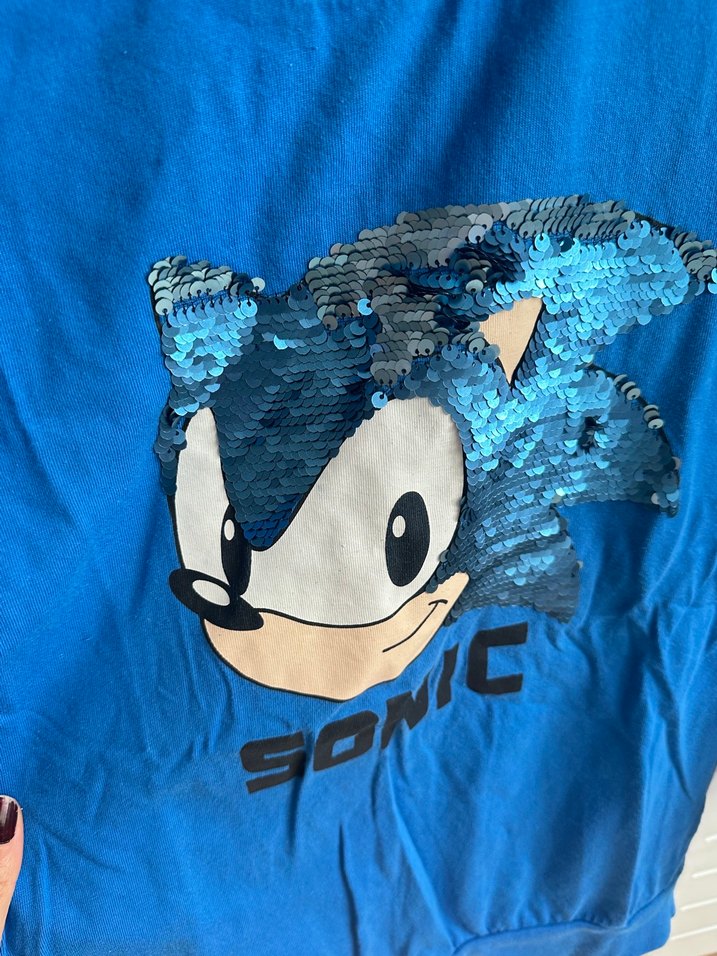 Bu mavi kedi kıyafeti, parlak payetlerle süslenmiş Sonic baskısına sahip, pop kültür ve ışıltılı detayları bir araya getiriyor.