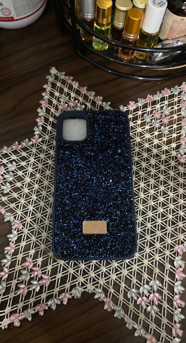 Koyu mavi, payetli yüzeye sahip ve streetwear tarzında şık telefon kılıfı. İPhone 11 kılıfı