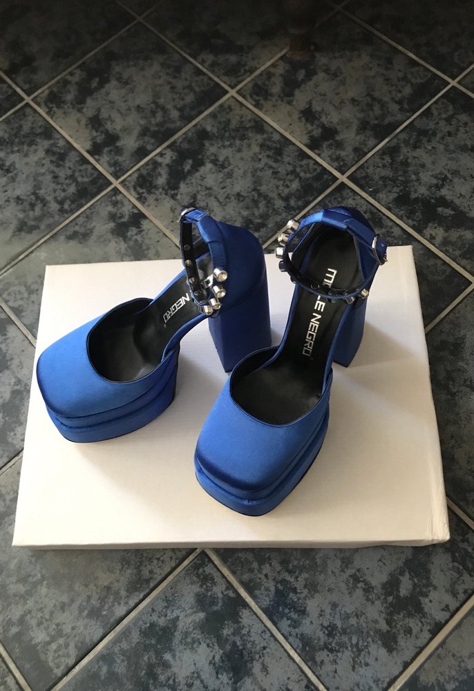 Mavi parlak platform topuklu ayakkabılar, kareli desen ve tokalı bilek detayına sahip. Kauçuk malzemeden yapılmıştır, avangart tarz için uygundur.Marka temsilidir