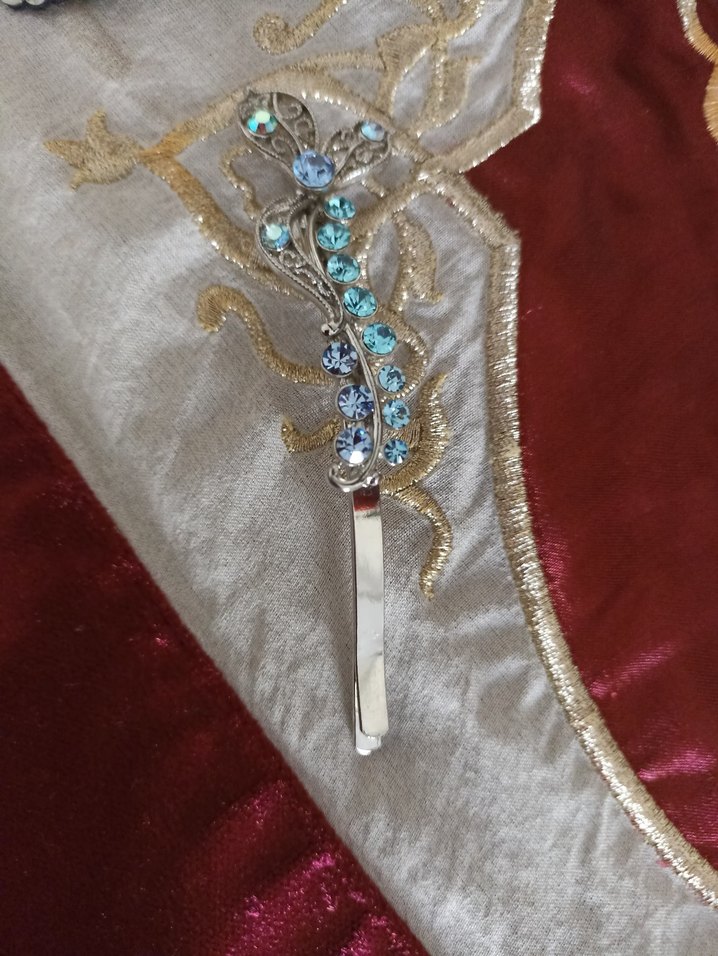 Mavi parlak pullarla süslenmiş, vintage tarzda klasik saç tokası. Görünüme ışıltı katmak için ideal. ✨