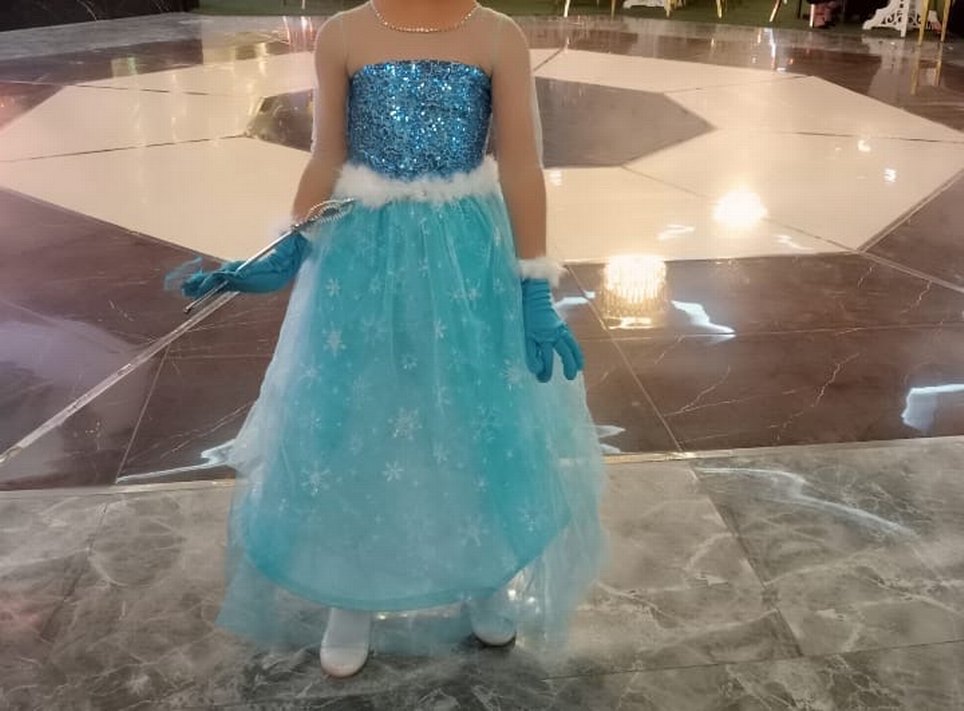Mavi straplez elbise, parlak pullu dar kesim üst kısmı ve kar tanesi desenli renkli etek kısmı ile. Kolsuz ve sentetik kumaştan üretilmiştir. ❄️