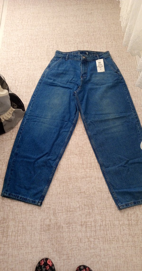 Mavi parlak renkte, rahat kesim kadın kot pantolon. Midi boyu ve desen içermeyen tasarımıyla günlük kullanıma uygundur.