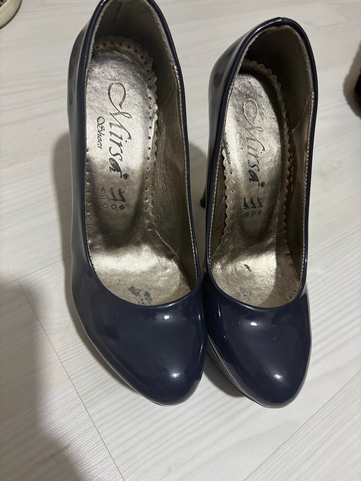Parlak mavi rugan yüzeye sahip klasik stiletto topuklu ayakkabılar, modern tasarımıyla ofis için uygundur. Kauçuk malzeme dayanıklılık sağlar.
