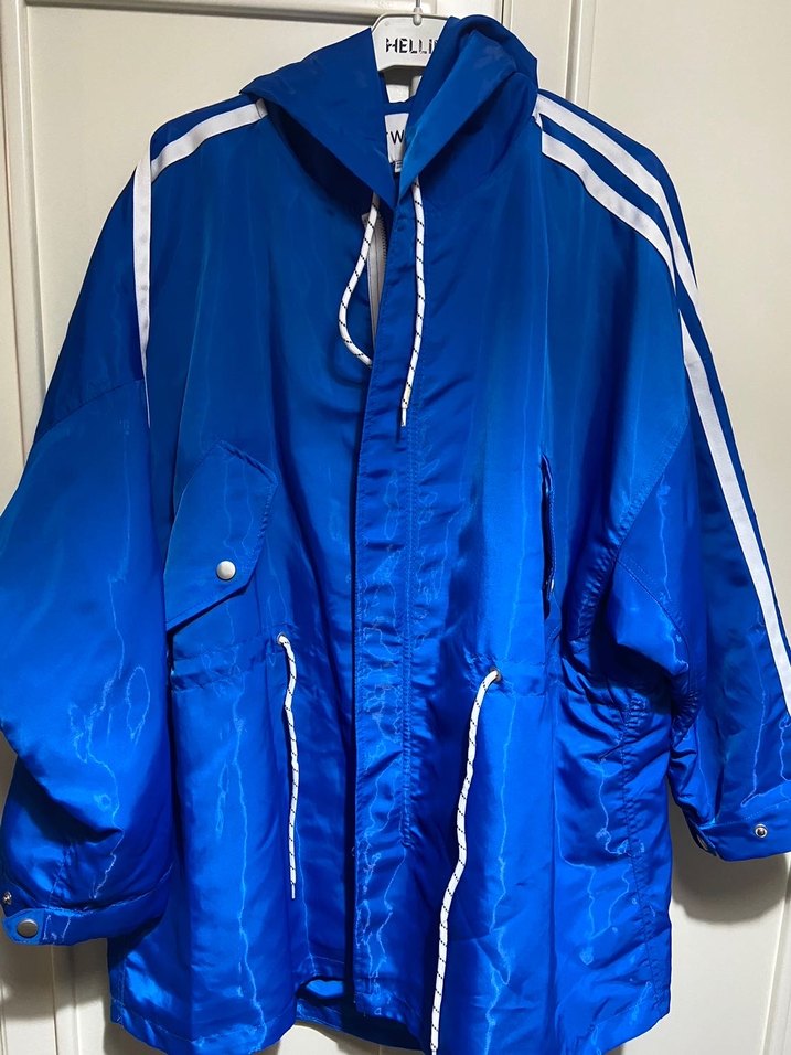 Parlak mavi rüzgarlık, bol kesim, uzun kollu ve yüksek yakalıdır. Fermuarlı önde, omuzlarda beyaz şeritler ve kullanışlı ceplere sahiptir. Tertemiz bir ürün