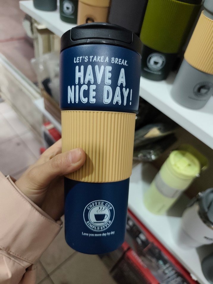 Bej tutma kısmı ve 'Let's take a break. Have a nice day!' yazısı bulunan mavi parlak seyahat termosu. Sıcak içecekler için kapaklı tasarım. ☕