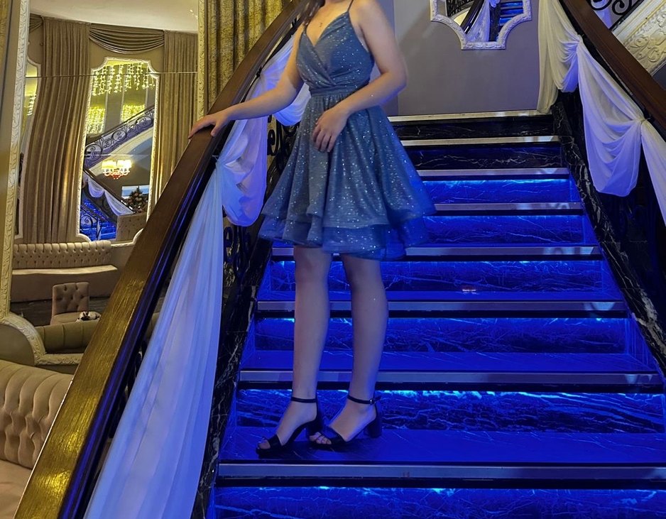 Simli, mavi, mini abiye elbise, modern baskılı desene sahip, cesur parti tarzları için ideal. ✨ çok çok güzel 36-38 beden uyumlu