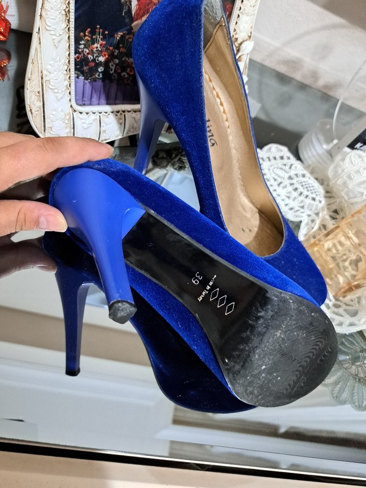 Mavi parlak stiletto topuklu ayakkabılar, kemerli detaya sahip. Yılan desenli ve kauçuk tabanlı, romantik akşamlar için uygun.