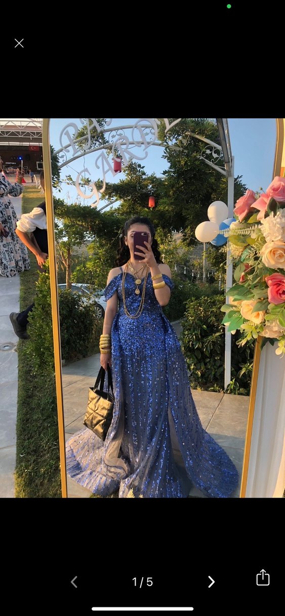 Parlak mavi, straplez ve askılı uzun abiye elbise, ışıltılı desenlerle göz alıcı bir şıklık sunar. ✨