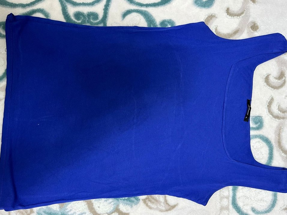Mavi parlak sentetik kumaştan, tek renk, tekne yakalı ve kolsuz, normal uzunlukta, minimal ve normcore tarzda kadın bluzu.