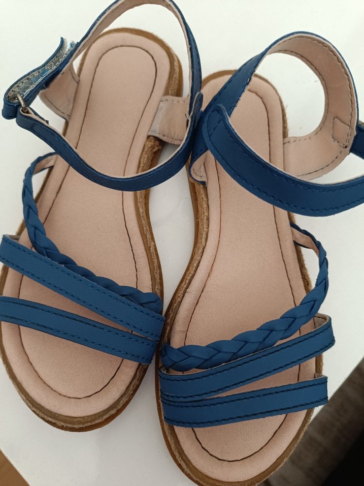 Parlak mavi renkte, tokalı ve örgü detaylı kız sandaletleri, dayanıklı kauçuk malzemeden yapılmıştır.