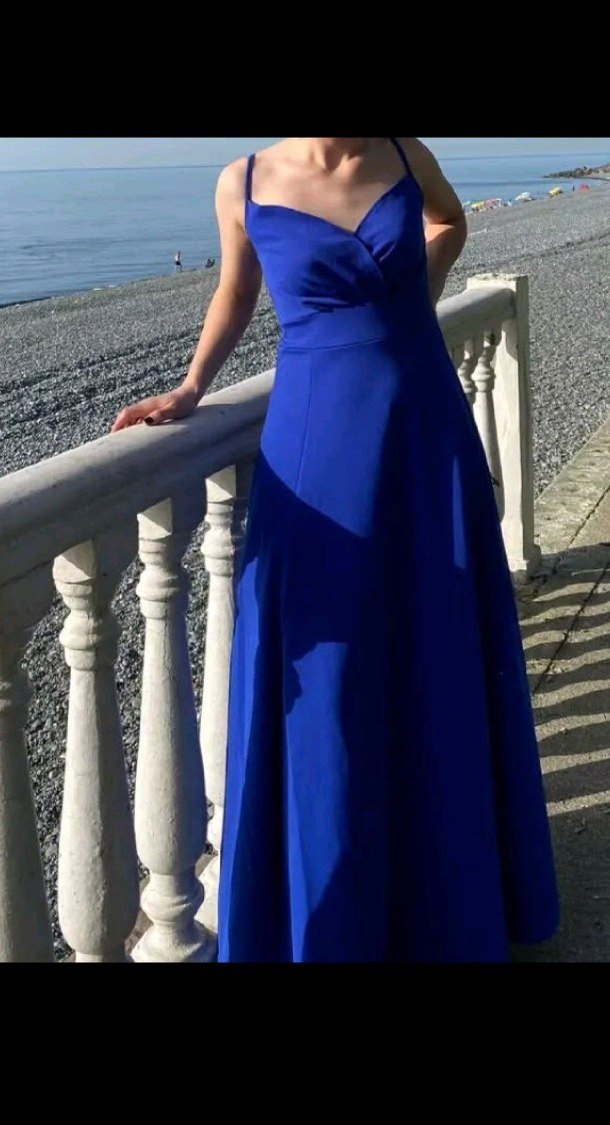 Mavi parlak kumaş, drapeli tasarım ve V yakaya sahip, ince askılı, uzun ve vücuda oturan abiye elbise. Modern klasik şıklık sunar, düğün için uygun.