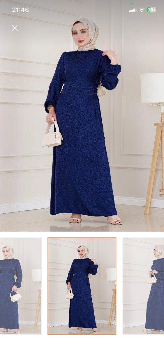 Parlak mavi renkte, drapeli uzun elbise. Bisiklet yaka ve ince askılı kollara sahip, günlük kullanıma uygun, düz kesim. Sentetik kumaştan üretilmiştir.