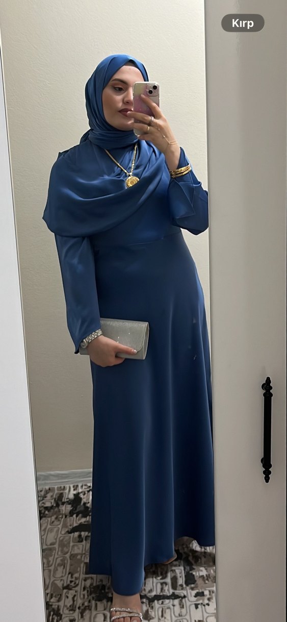 Mavi Parlak Uzun Drapeli Kadın Elbise