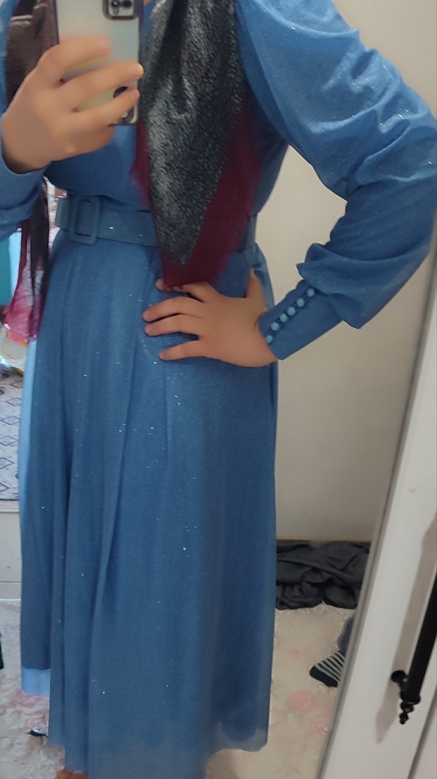 Mavi parlak kumaştan, uzun, bol kesim, drapeli, çıtçıtlı manşetli ve yaka detaylı kadın abiye elbise. Modest ve vintage tarzda, günlük kullanıma uygun.