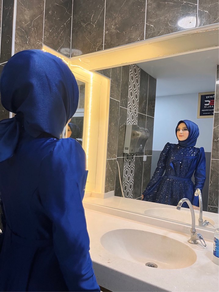 Mavi parlak kumaştan, yüksek yakalı ve uzun kollu, drapeli tasarıma sahip kadın elbisesi. Düzenli kesim ve baskılı deseni ile gösterişli ve modest tarzda. 36/38 beden 1 kere giyilmiştir