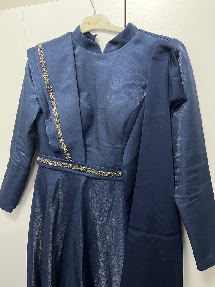 Sadece 2 kez özel günde giyildi. 42 beden, tam kalıp. Petrol mavisi, taş detaylı, hakim yaka uzun abiye. Kumaşı hafif parlak, çok şık duruyor. Herhangi bir kusuru yoktur. Eşarbı ile birlikte gönderilecektir. Ciddi alıcıya küçük indirim yapılır. Eşarbı elbise ile tam aynı ton, kombin derdi yoktur. “Kargo ertesi gün