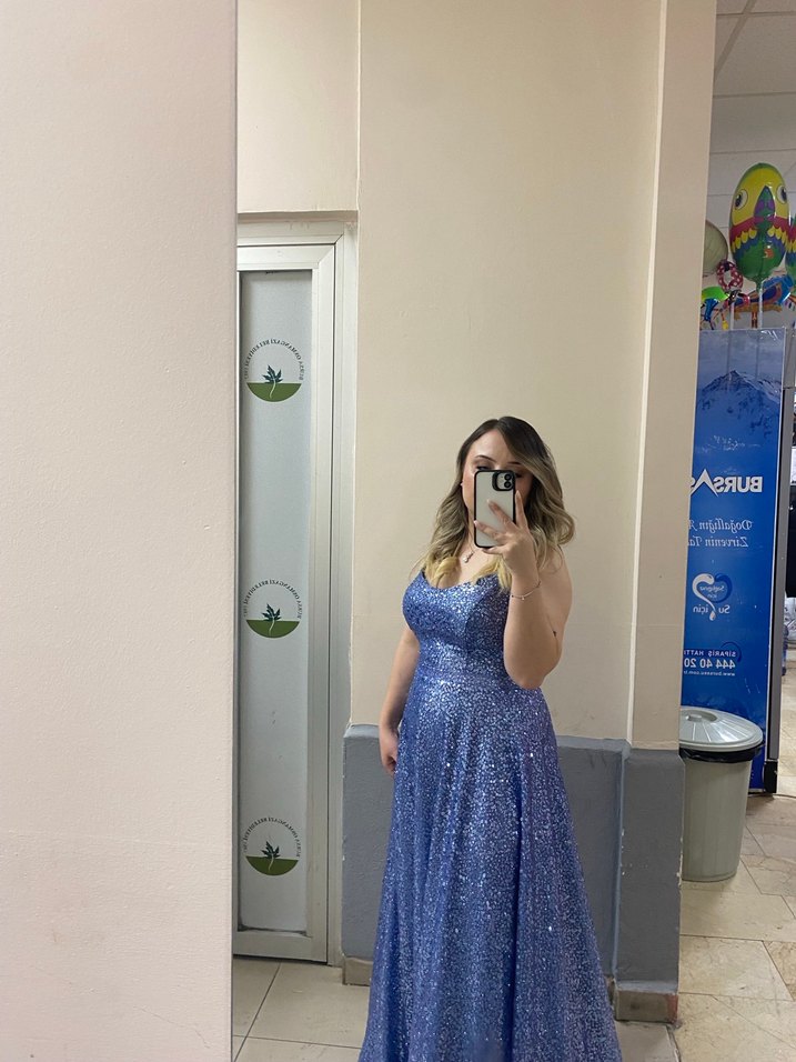 Mavi, straplez, kolsuz, simli kumaştan yapılmış, vücuda oturan uzun abiye elbise. Düğün ve özel etkinlikler için uygundur. Beden 42 bir kez kullanıldı